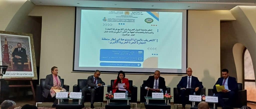 نظمت جامعة الدول العربية (إدارة التكامل الاقتصادي) بشراكة مع وزارة الصناعة والتجارة وغرفة التجارة والصناعة والخدمات لجهة مراكش آسفي، ورشات عمل حول التعريف بالمزايا الممنوحة في إطار منطقة التجارة الحرة العربية الكبرى، يومي الخميس والجمعة 02 و03 أبريل 2026، بالمقر الجهوي للغرفة بمراكش.